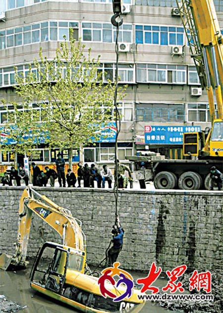 百噸吊車前來救援。 生活日報4月16日訊(記者 趙國陸)今天早上,一臺挖掘機在明湖西路的泄洪溝內清淤,不料淤泥太深,挖掘機陷入溝底不能自拔。百噸吊車前來救援,承重20噸的鋼纜一度繃斷,折騰了4個多小時,終于將這個笨重的家伙拖上岸。 上午,順河高架橋北首,一臺挖掘機歪倒在橋下的泄洪溝里,大半個機體陷入黑色的淤泥中,無法動彈。據附近的一位居民說,這兩天,該挖掘機一直在溝底清理淤泥。今天早上8點多的時候,正在施工的挖掘機突然傾斜,在松軟的淤泥里越陷越深,最后無法動彈。司機見狀,只好熄火,爬出駕駛室,順著吊臂爬到岸上。他說,可能底下有坑,不知情才栽了。 上午11點多,一輛100噸的大型起重機開到河岸邊救援,工人用木枕墊起支腿,吊臂緩緩地放下鋼絲繩。3名工人爬到溝底,將吊鉤固定在挖掘機上。隨著機器轟鳴聲,吊車開始慢慢地起吊,“砰”的一聲響,承重20噸的鋼絲繩突然斷了,挖掘機又掉下去了。 圍觀的群眾不約而同地長噓一聲。起重機把墊支腿的木枕換成鋼板,換上承重40噸的鋼絲繩,兩名工人隨著鋼絲繩再次下溝底。但新問題出現了,由于剛才固定在挖掘機上的吊鉤被拉彎,取不下來。粗鋼絲繩無法固定了。救援暫時陷入停頓。工人去找切割機助陣,將吊鉤割斷,重新固定。 下午3:45,一切準備就緒,挖掘機終于被拉上河岸。這個笨重的家伙除了弄了一身臟水外,并沒有受到損傷,可以繼續施工。