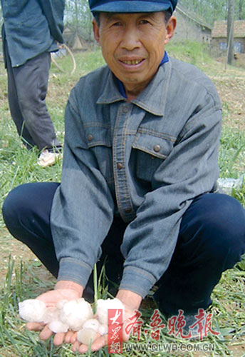 左圖:金鄉蒜農在冰雹襲擊過的蒜地里失聲痛哭! 埡昀凇z