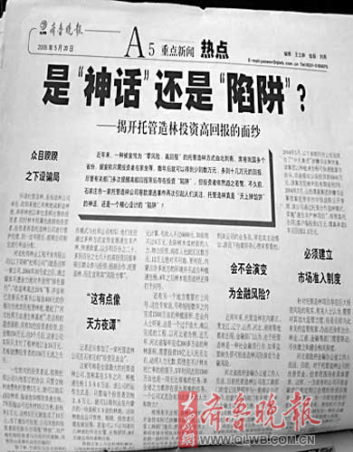 2005年5月11日,受害人張女士到歷下經(jīng)偵大隊報案稱,2004年10月份,她在某小區(qū)遇到了“馳太木業(yè)”宣傳點。10月28日,她來到“馳太木業(yè)”位于中銀大廈的辦公地點,工作人員王某極力宣傳托管造林收益很高、風險很小,并說林地種植的是7年速生楊,如果投資的話收益率能達到60%至70%,投資合同簽訂后3到6個月為她辦理林權(quán)證。張女士購買了“馳太木業(yè)”已經(jīng)生長了3年的速生楊林地10畝,地點在高唐縣,每畝5500元。一直等到報案,張女士也沒有等來林權(quán)證。