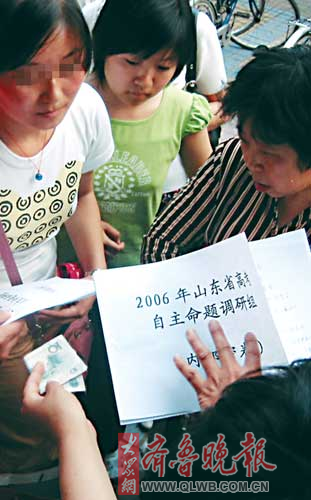 一名賣“試題”的女孩被警方帶走。 喬顯佳 攝 高考首日,在濟南十幾個考點,一些大學生模樣的人以每份20元的價格兜售“高考試題”,本報記者聯合省城警方,戳穿了“試題”騙局。 “這套試題是通過關系從參加今年自主命題的專家那里得到的,這些題目將有90%以上都會在高考試題中出現,上午的作文題目就和試題中的一個作文題目吻合,足以看出它的權威性。”一個20多歲自稱“高校學生”的清秀女孩向陪考的學生家長推銷著她手中的試題。 高考首日中午,省城幾個考點附近出現了2006年高考五套試題及答案,雖然語文試題只有兩個作文題目,但其中之一與當日高考的語文作文題目驚人相似,這樣巨大誘惑讓陪考的學生家長難免心動,不少家長掏錢購買。 “內部密卷”悄然現身 。啡障挛缈荚嚳颇繛閿祵W。下午3時許,位于濟南一中考點門口東側的一個小飯館門前一陣騷動。一名身著綠色上衣,牛仔褲的女孩正在散發一份資料,而資料的封面更加具有誘惑性——“2006年山東省高考自主命題調研組(內部密卷)”。 與此同時,濟南中學校門西側也出現了兩男兩女的身影,他們也在用較有煽動性的話極力地贊譽他們手中同樣的試題。記者從一名女孩手中接過一份“高考試題”,第一頁上只有兩個作文題目,第二個題目與7日上午高考試題的作文題目非常相似,只是真題中要求“字數800字”,而女孩提供的題目要求“字數600字”。 當天下午,濟南二中考點附近也有一些大學生模樣的人在兜售這樣的試題,根據濟南警方和部分中學反饋的消息,7日,在濟南有十多個考點出現同樣的“高考試題”。 家長疑慮仍然購買 下午4時左右,在濟南中學附近的陪考人群中,“高考試題”成為了眾人談論的焦點話題,多數家長對此心存疑慮,但大家也不打算失去這個“天上掉下來的餡餅”。 “如果你這套試題是在昨天看考場的時候或者今天語文考試之前賣,別說20元錢,就是賣到200元一份,也有很多人買。”一位學生家長說。 女孩沉著應答:“這樣的題目在開考之前不可能拿到,這也是通過關系拿到的,試題的準確性你們就不要有什么疑問了,已經賣出去不少了,買了不會讓你后悔! 盡管這套試題疑點越來越多,但陪考家長開始紛紛掏錢購買,一位男士說:“20元錢也不算貴,如果有用處,就很值得,沒有用也就算了,就當買份報紙看看! 一些家長盡管買了這份試題,但更多的是對這種從天而降的“高考試題”有些擔心。一位考生母親說,這樣的試題如果是假的,會對孩子造成巨大的負面影響,孩子如果也相信這套試題會和高考題目吻合,而一旦發現情況有變,即“高考試題”是假的,那么心情就很難調整過來,影響發揮在所難免,所以一些學生家長說:“即使買了這份試題也不會輕易把它給孩子看,除非有十足的把握,才有可能拿給孩子。” 記者報案警方出擊 在這些推銷人員的鼓動下,購買“高考試題”的家長越來越多,本報記者擔心這樣發展下去,將會對考生及考試秩序造成影響,于是決定報警。 濟南中學考點,市中區公安分局的民警接到記者舉報,立即采取行動,先后將兩個正在兜售試題的女孩帶到該考點的值班室。濟南一中、濟南二中等考點執勤的民警及城管執法人員也緊急出擊,將兜售試題的相關人員控制住。 考務人員驗出假題 別的考點也接到了舉報,濟南市大明湖派出所孟鈞副所長介紹,接警后,他們隨即向考點考務負責人及正在巡查的濟南市教育局主要負責人作了匯報。后者立即著手驗證試題真偽。經考務人員將該套試題逐個與正在考試的數學試卷對照,斷定被買賣的“內部密卷”毫無價值。 經過警方審問查明,被抓獲的賣試題的人多是在校大學生。6日下午,當他們趕到位于北坦大街的某培訓學校應聘文具推銷員時,一名姓秦的男子才告訴他們是賣高考預測題。 下午6時許,秦某被大明湖派出所依法傳喚至所里。他交代,預測題是濟南某中學一名張姓老師給他的,封面則是他設計制作的,目的就是好賣。除了作文題,其他預測題他早就拿到了,共印了1200份。7日中午1時許,他才拿到語文試題,加急印了1200份后,與其他試題一起裝訂后才分給學生,每人大約35份。秦某稱,他雇用了30多名大學生,分布在十余個考點。 目前,警方正在聯系秦某所稱的中學老師,進一步展開調查。 |