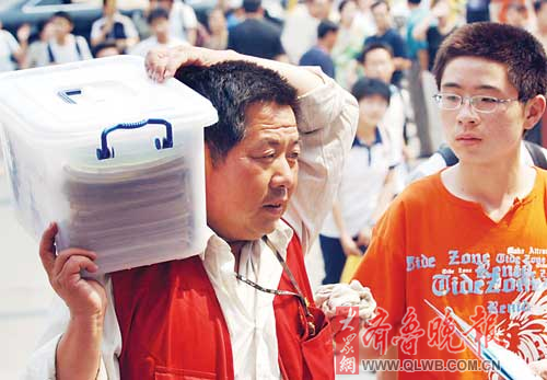 這位父親幫兒子扛了一大箱子書,送到考點門口。本報記者 劉軍 攝