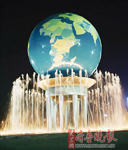 “水·地球”雕塑由直徑3米、可均勻旋轉(zhuǎn)的地球儀,代表世界五大洲的9條著名的河流模型,展示泉城風(fēng)光的旅游櫥窗,以及噴泉、燈光、音響等系統(tǒng)組成。