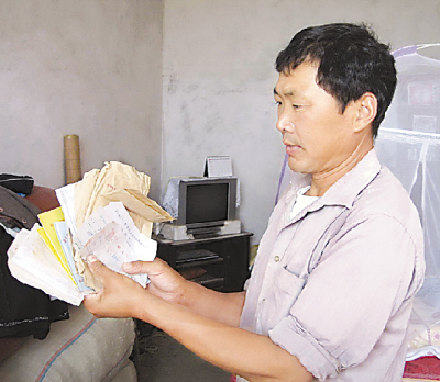 朱建華今年45歲,發(fā)黃的票據(jù)足以印證一段歷史。他家有5口人,承包4畝多責(zé)任田。1993年,他上交“三提五統(tǒng)”等435元,此后開始“爬樓梯”,收取也不規(guī)范。朱建華喝過一些墨水,喜歡較真,自己記賬。1994年至2001年,負(fù)擔(dān)卡外還有負(fù)擔(dān),連票據(jù)都沒有。1994年負(fù)擔(dān)卡上為492元,實(shí)收523元;1997年負(fù)擔(dān)卡上為694元,實(shí)收1103元;2000年負(fù)擔(dān)卡上為781元,實(shí)收1514元。1995年的票據(jù)共8張,只有收款金額,沒有收款項(xiàng)目,合計(jì)996元。