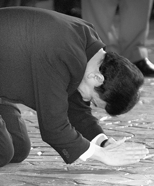 2月28日,泰國前總理他信·西那瓦在步出曼谷素萬那普國際機(jī)場貴賓室后雙膝跪地。新華社發(fā)