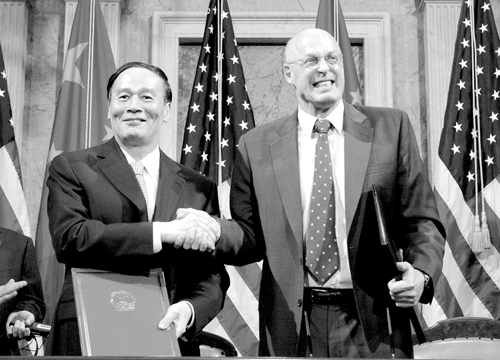 6月18日,中國(guó)國(guó)家主席胡錦濤的特別代表、國(guó)務(wù)院副總理王岐山和美國(guó)總統(tǒng)布什的特別代表、財(cái)政部長(zhǎng)保爾森在美國(guó)財(cái)政部共同簽署了《中美能源環(huán)境十年合作框架》文件。這是王岐山和保爾森簽署《中美能源環(huán)境十年合作框架》文件后握手。□新華社發(fā)