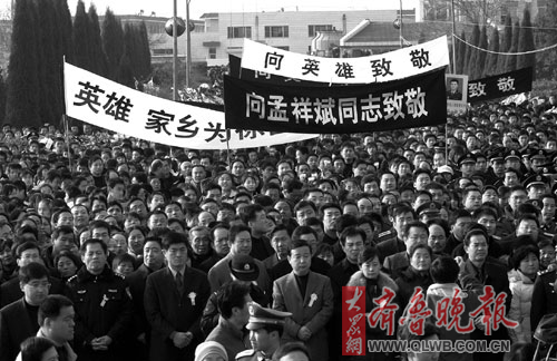 12月7日下午兩點半,孟祥斌烈士骨灰安放儀式即將舉行,當齊河縣數萬余群眾齊聚縣烈士陵園內,等待這莊嚴的一刻時,整個縣城幾乎為之空巷。