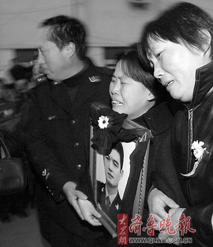 晚上6點,當四名武警官兵終于將靈柩運回孟祥斌家鄉劉橋村,放到靈棚里時,已經坐了一天一夜火車的孟祥斌妻子葉慶華,一把拉住幾乎哭倒在地的嫂子:“不哭,我們不哭。”