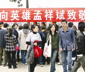 2008年4月2日中午,吸引了大批的學生圍過來了解孟祥斌的英雄事跡。記者 田振龍 攝