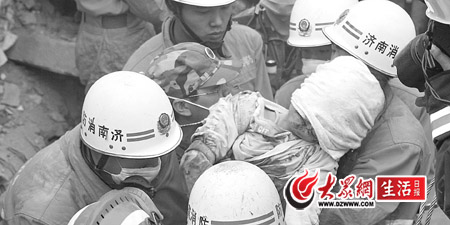 濟南市消防支隊副支隊長王茁飛馬上指揮隊員搜救。“隊員們用搜救犬、生命探測儀進行搜救,聽到廢墟下面有微弱的呼救聲。”通過進一步勘查,救援隊員發現尚婷被埋得很深,她的上面有三層水泥預制板,預制板的中間還夾雜著石塊。