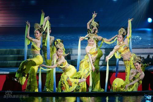 在今年春晚上,舞蹈《飛天》引人關注:七名仙女打扮的舞蹈演員站在升降舞臺上,用肢體配合音樂演繹出敦煌壁畫中的飛天形象,配合著舞臺上飄落的花瓣和臺下噴涌而出的水花,一起將觀眾引入“仙境”。