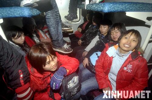 1月31日,幾名乘客登上廣州火車東站開往洛陽的列車后露出笑容。 經鐵路部門全力調度,目前京廣鐵路運輸秩序正逐步恢復。鐵道部支援廣鐵集團的第一批28列列車1月30日已全部上線運行。 新華社記者 壯錦攝