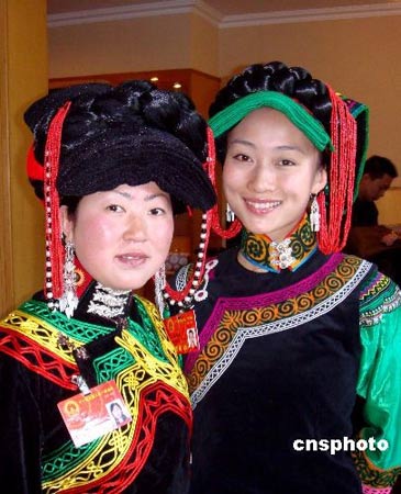 一對(duì)彝族“姐妹花”,一個(gè)穿紅,一個(gè)著綠,一樣甜美的笑臉,她們是赴京參加第十一屆全國(guó)人大的四川代表中年紀(jì)最小的兩位——一九八0年十二月出生的雅安市石棉縣安順鄉(xiāng)鹿子坪村婦女主任毛金芳和一九八二年四月出生的涼山州歌舞團(tuán)三級(jí)舞蹈演員張蓓蓓。