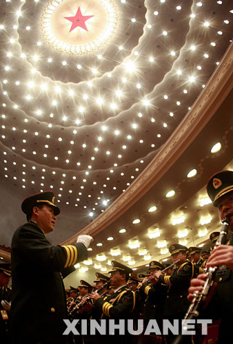 3月3日,中國人民政治協(xié)商會議第十一屆全國委員會第一次會議在北京人民大會堂開幕。這是軍樂團(tuán)高奏國歌。 新華社記者鞠鵬攝