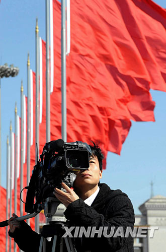 3月3日,攝像記者在北京人民大會堂前采訪拍攝。新華社記者 李濤 攝 |