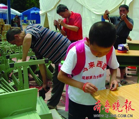 ▲孩子們的課桌上,畫(huà)了一大片的"心"。 本報(bào)救援報(bào)道特派記者邱志強(qiáng)攝 11歲的鄧青泉幫助安裝課桌。 本報(bào)救援報(bào)道特派記者郝東智攝 “來(lái)新課桌了,還有好多圖書(shū)和乒乓球桌!”28日,滿載桌椅、體育器材的卡車駛?cè)刖胖迬づ駥W(xué)校后,吸引了不少學(xué)生圍觀,有的學(xué)生試探著問(wèn):“給我們的吧?我喜歡看課外書(shū),這里一本都沒(méi)有。” 我想早點(diǎn)用上這些課桌 350套桌椅和10個(gè)乒乓球桌很快被眾人卸下,跟車來(lái)的6名安裝人員立刻拿起工具動(dòng)手干活。記者注意到,一名背著書(shū)包的小男孩悄悄加入到安裝桌椅的隊(duì)伍中,因?yàn)闆](méi)有專業(yè)工具,他能做的僅僅是把螺絲釘安裝到桌子上,然后再由工作人員調(diào)整高度、擰緊。 這名小男孩是來(lái)自劉漢希望小學(xué)的鄧青泉,今年11歲,現(xiàn)在在帳篷學(xué)校四年級(jí)(2)班上學(xué),在去教室的路上,小青泉看到來(lái)了新桌椅就過(guò)來(lái)幫忙,“我很喜歡這樣的桌椅,希望能早點(diǎn)用上。”記者問(wèn)他熱不熱,他回答說(shuō):“熱,旁邊有自來(lái)水,洗把臉就不熱了。” 安裝師傅楊福國(guó)28日凌晨跟車來(lái)到綿陽(yáng),在帳篷里休息不到3個(gè)小時(shí),現(xiàn)在他有些體力不支,“今天太熱了,但我們還是想早點(diǎn)給學(xué)生們安好。”他指著小青泉說(shuō),“這孩子真讓人心疼。” 晚上寂寞最想看故事書(shū) 在初二(1)班的教室里,幾名同學(xué)正在聊天。女生趙明倩告訴記者,她來(lái)自擂鼓鎮(zhèn)中學(xué),家里的房子被震塌了,13日起她就來(lái)到帳篷學(xué)校讀書(shū)。“現(xiàn)在我們的語(yǔ)文、數(shù)學(xué)、英語(yǔ)、物理課本都有了,歷史、地理、生物的書(shū)還沒(méi)有,課外閱讀書(shū)一本都沒(méi)有。課本都是帳篷學(xué)校發(fā)的,原來(lái)的學(xué)校塌了,什么都拿不出來(lái)了。”記者問(wèn)同學(xué)們業(yè)余時(shí)間怎么過(guò),趙明倩不假思索地說(shuō):“在教室里聊天,感覺(jué)特別浪費(fèi)時(shí)間。我們晚上感到特別寂寞,我喜歡看一些故事書(shū),可這里一本都沒(méi)有。叔叔,你們帶來(lái)的書(shū)什么時(shí)候能借啊?” 家住擂鼓鎮(zhèn)幼兒園的鐘金池在帳篷學(xué)校初三(2)班學(xué)習(xí),他搶先拿了本名著《最后一課》翻看,他說(shuō)自己喜歡看科普類和軍事類圖書(shū),“地震的時(shí)候,擂鼓鎮(zhèn)中學(xué)真像擂鼓一樣的響,真能嚇?biāo)廊恕N覀儎偱艹鰜?lái),房子就倒塌了。學(xué)校原來(lái)有個(gè)圖書(shū)館,書(shū)都是舊的。”之所以選擇《最后一課》,是因?yàn)檫@本書(shū)的名字觸動(dòng)了他,“好多學(xué)生都是在上課時(shí)遇難的,也是最后一課,我想看看這本書(shū)寫的是什么。” 想盡辦法減輕學(xué)生壓力 帳篷學(xué)校負(fù)責(zé)人胡東介紹,目前學(xué)校初中部有210人,小學(xué)部有160人,人數(shù)最多的時(shí)候初中部有400人,小學(xué)部有500人。“現(xiàn)在學(xué)生少了,因?yàn)楹芏鄬W(xué)生被父母帶回家了,有的在家附近的臨時(shí)學(xué)校讀書(shū)。本來(lái)我們只是想開(kāi)設(shè)心理健康課,減輕學(xué)生的恐懼和壓力,但是時(shí)間一長(zhǎng),怕耽誤孩子們的學(xué)習(xí),就開(kāi)設(shè)了文化課。” 胡東介紹,現(xiàn)在學(xué)校準(zhǔn)備了30個(gè)板房教室,每個(gè)教室大約50平方米。“綿陽(yáng)一中翟勇和魏東兩位副校長(zhǎng)具體負(fù)責(zé)帳篷學(xué)校的教學(xué)和管理,這批山東捐助的圖書(shū)和體育器材,我們會(huì)安排專人管理,等活動(dòng)板房安排好了,學(xué)生們就可以在愛(ài)心圖書(shū)室里看書(shū)了。” |