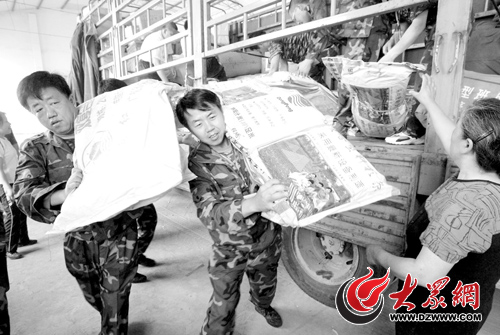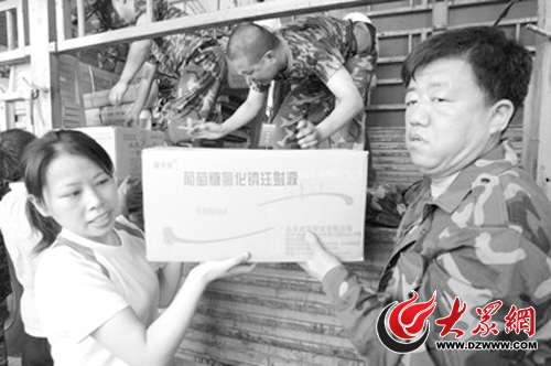 6月3日,煙臺市的救援物資正在裝車。煙臺市援建的北川縣漩坪鄉和白坭鄉都是重災區,至今道路不通。為此,煙臺及時調整救災策略,緊急購置了5艘沖鋒舟、5部亞星電話,通過水路運輸物資,為災區群眾打開了一條生命線。 。ㄌ嘏捎浾摺蛎瘛報道) | |