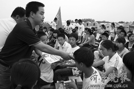 由于教學樓都已成了危房,德陽市內所有的中小學臨時放假,而在綿竹市體育場臨時安置點有一所愛心帳篷學校,在這里,志愿者、老師帶著120多名孩子還在堅持上課。