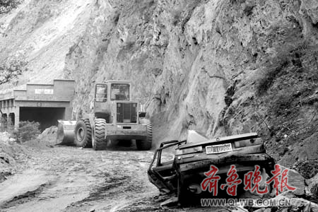這條危險路段長達300米,山體與地面呈直角,上方還不斷有石塊滑落。我們的車就從剛推開的石堆上通過,路面上到處都是一道道高嶺,顛得大家的頭一次次撞上車頂。一輛轎車還被埋在泥土中,僅露出一個保險杠,現場的推土機趁車輛通過的間隙急忙啟動盡量把路上的泥土再推開些,路面上飛揚的塵土給司機駕車帶來了很大的麻煩,每兩輛車中間都是間隔500米左右。