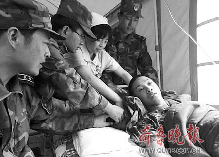 本報汶川5月21日訊 濟南軍區一名戰士在徒步進入汶川救災的途中,被飛石砸斷了右腿,在汶川手術治療過程中,因自己的堅強感動了護理的護士,并因此在災區認了個“媽媽”。