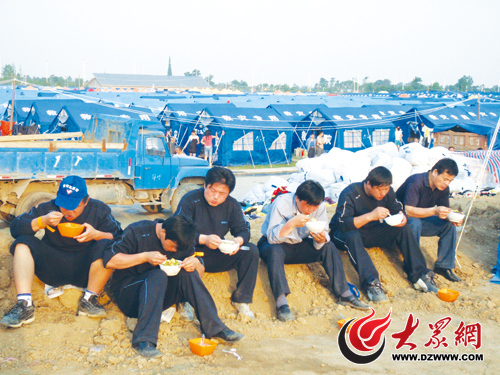 來自長清的志愿者在工作間隙吃飯(張智慧攝)。