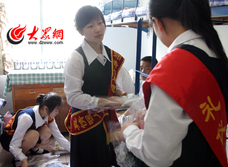 濟南幼兒師范的志愿者忙碌著為弟弟妹妹分發生活用品