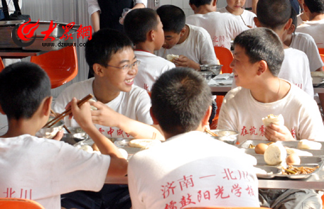 大眾網(wǎng)濟(jì)南6月5日訊 (記者 陳琛 吳哲)首批來濟(jì)過渡復(fù)學(xué)的848名北川縣擂鼓鎮(zhèn)師生今天凌晨 抵達(dá)濟(jì)南。濟(jì)南市市長(zhǎng)張建國親自到火車站迎接并為北川縣擂鼓鎮(zhèn)848名師生授旗 。隨后,災(zāi)區(qū)師生分乘大巴車直赴四所學(xué)校。孩子們被安排在環(huán)境整潔的學(xué)生宿舍中,領(lǐng)到了統(tǒng)一的服裝、文具和毛巾、牙刷等生活日用品。