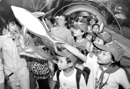 □新華社發(fā) 5月31日,來自四川綿陽市的孩子們在青島海底世界游覽。當(dāng)日,10名四川綿陽市的小朋友被邀請到青島過“六一”,參加游覽海底世界等各項(xiàng)活動。據(jù)了解,孩子們還將與島城熱心家庭結(jié)成愛心對子,以進(jìn)行長期的資助和“心理幫扶”。 |
