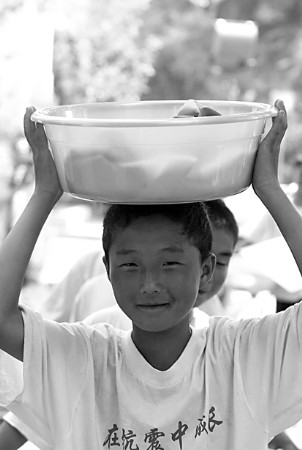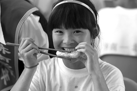 山東的飯菜真香!6月5日,808名北川災區孩子抵達濟南,準備復課。 周青先攝