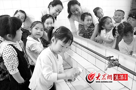 6日,在濰坊市市區(qū)天昱幼兒園內(nèi),孩子們正在老師的指導(dǎo)下正確洗手。