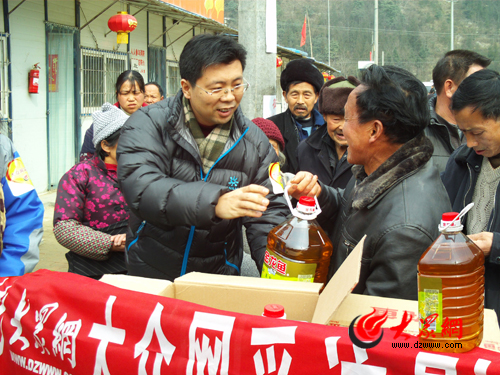 圖為大眾網(wǎng)總編輯助理曲濤代表大眾網(wǎng)全體員工和愛心網(wǎng)友將年貨發(fā)放到東溪溝村和華林村村民手中