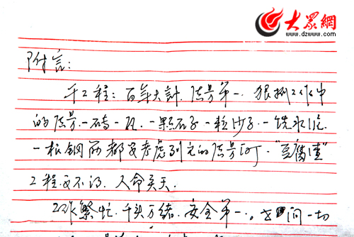 大眾網北川1月23日訊 (大眾網特派記者 曲濤)詩云:烽火連三月,家書抵萬金。今天:地震援建處,家書感人心。在淄博援建點北川縣香泉小學施工現場,記者見到了年邁父親寫給援建施工現場兒子的一封家書,堪抵萬金。