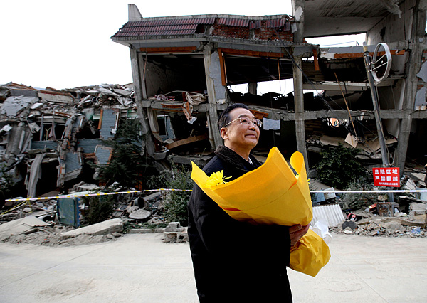 1月24日至25日,中共中央政治局常委、國務院總理溫家寶來到四川受災最為嚴重的北川、德陽、汶川等地,和災區人民一起過年。這是1月24日,溫家寶專程來到北川縣城遺址向大地震中遇難的同胞們獻花。新華社記者 姚大偉 攝
