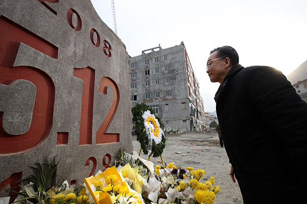 1月24日至25日,中共中央政治局常委、國務院總理溫家寶來到四川受災最為嚴重的北川、德陽、汶川等地,和災區人民一起過年。這是1月24日,溫家寶專程來到北川縣城遺址,在“5·12”地震紀念碑前向大地震中遇難的同胞們獻花、默哀。新華社記者 姚大偉 攝
