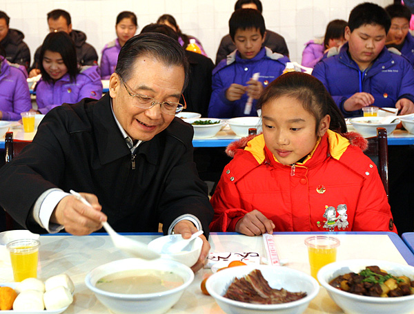 1月24日至25日,中共中央政治局常委、國務院總理溫家寶來到四川受災最為嚴重的北川、德陽、汶川等地,和災區人民一起過年。這是1月24日,溫家寶在北川中學食堂與學生們吃年夜飯時給身邊的小朱可盛稀飯。新華社記者 姚大偉 攝