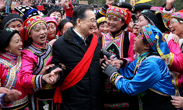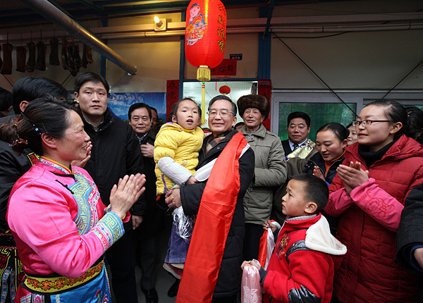 1月24日至25日,中共中央政治局常委、國務院總理溫家寶來到四川受災最為嚴重的北川、德陽、汶川等地,和災區人民一起過年。這是1月24日,溫家寶在北川縣擂鼓鎮貓兒石村看望羌族群眾。新華社記者 姚大偉 攝
