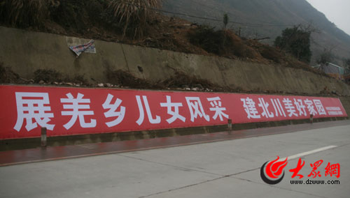 圖為北川馬路邊口號“展羌鄉兒女風采 建北川美好家園”。
