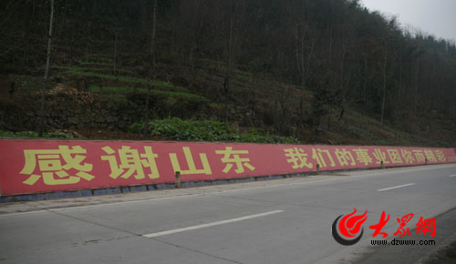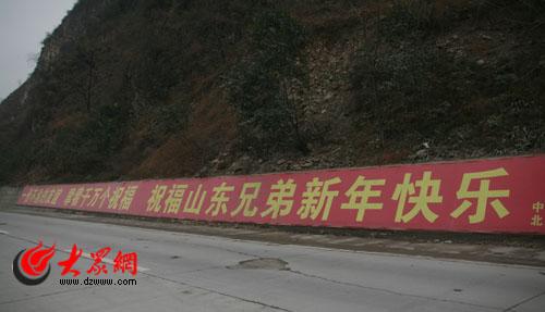 北川馬路邊感恩的口號“一份不渝的友誼 摯著千萬個祝福 祝福山東兄弟新年快樂”。