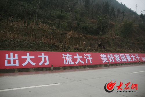 大眾網北川1月27日訊 通往北川縣城的公路上隨處可見大幅的標語,鼓舞著北川人民重建家園,感恩社會,感恩山東人民。圖為北川馬路邊鼓舞士氣的口號“自強自立有骨氣 不等不靠有脾氣(有脾氣:有志氣的意思)