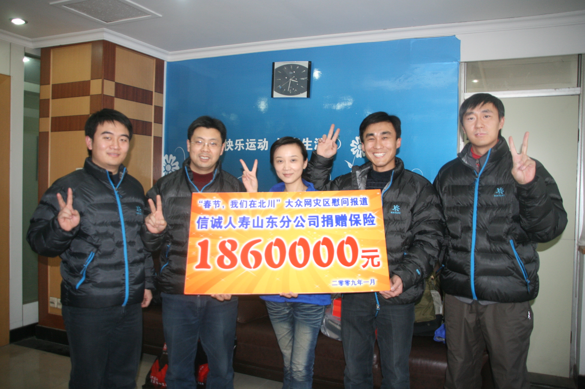 大眾網濟南1月21日訊 21日下午,大眾網、齊魯手機報特派記者將與各報紙記者、熱心網友共同組成聯合報道組,帶著大眾網員工及山東人民、廣大網友捐助的善款奔赴山東對口援建的北川縣。信誠人壽作為一家具有強烈社會責任感的保險公司,一貫用心聆聽社會需求,主動承擔社會責任。為大眾網記者及網友贈送186萬元的信誠團體意外傷害保險和信誠附加意外傷害團體醫療保險。