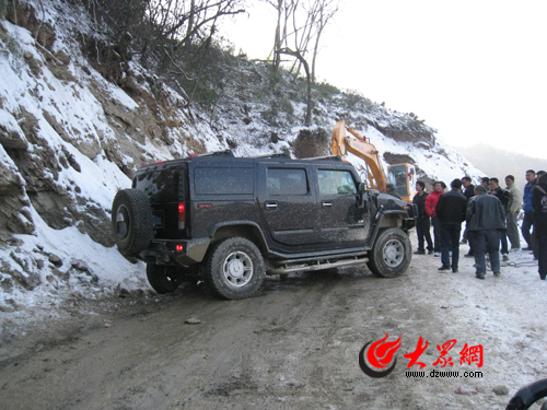 據北川縣副縣長雷建新介紹,受降雪影響,擂禹路有近18公里路段出現冰雪路面,車輛難以通行,同時該路段還出現了兩處沉降。目前,北川縣已對擂禹路實行了交通管制,通行車輛必須裝備防滑鏈。記者見到,一輛“悍馬”因打滑不能前行。(特派記者組前方報道)