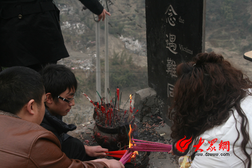 北川中學(xué)廢墟前,一束菊花頂著料峭寒風(fēng),給沉重的心情添上了一絲溫暖。學(xué)校已經(jīng)被鐵絲網(wǎng)圍起。鐵絲網(wǎng)上掛滿了寫著“哀念”的小白花,寄托著大家的哀悼和思念。學(xué)校旁邊豎起了“向5.12北川中學(xué)遇難的老師和同學(xué)敬香獻(xiàn)花”的牌子,牌子前的鮮花擺了一茬又一茬,香火不斷!坝鲭y學(xué)生和老師的親人家會(huì)到這里來(lái)上香燒紙,眼看過(guò)年了,格外想自己的娃娃”,當(dāng)?shù)刭u紙錢的老板指著旁邊一位燒紙錢的婦女告訴記者:“也有很多外地人專門來(lái)這里為學(xué)生們燒上一柱香!币粋(gè)在地震中遇難學(xué)生的父親拿著孩子生前的照片,不停的寫著孩子沒有完成的心愿,旁邊的母親已是淚流滿面。