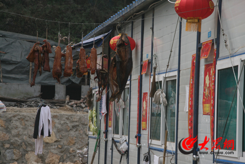 板房前的燈籠和臘肉顯示著春節(jié)的氣息