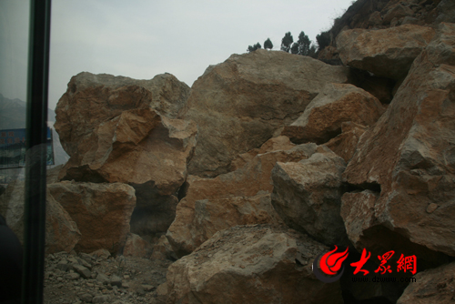 地震垮塌下來的巨石擋住了公路