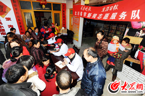 1月29日,大年初四,大眾報業(yè)集團新聞志愿服務隊的8名志愿者來到了北川縣擂鼓鎮(zhèn)茨溝村,為那里的村民進行免費體檢,發(fā)放、贈送藥品。在短短的3個多小時時間內,就有近200位村民享受了來自省城大醫(yī)院專家的面對面診斷。
