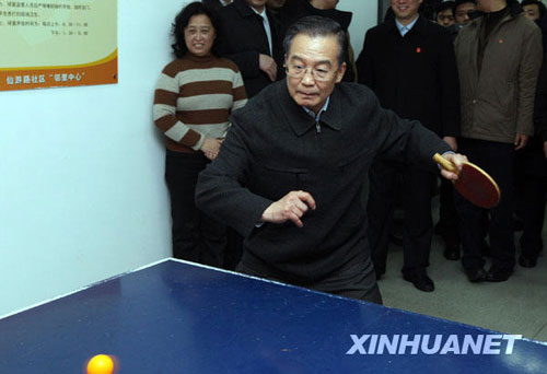 這是1月1日,溫家寶在青島仙游路社區(qū)服務(wù)中心看望社區(qū)居民時打乒乓球。新華社記者 姚大偉 攝