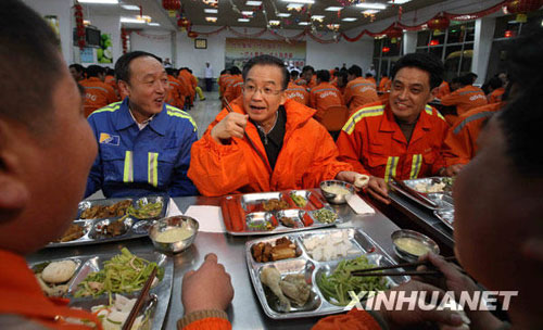 這是1月1日,溫家寶在青島港老港區職工餐廳和節日值守的職工們共進晚餐。