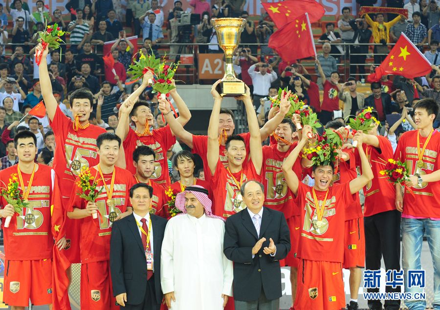 9月25日,中國隊球員在領獎臺上慶祝。當日,在武漢進行的第26屆男籃亞錦賽決賽中,中國隊以70比69戰勝約旦隊,奪得冠軍。新華社記者程敏攝