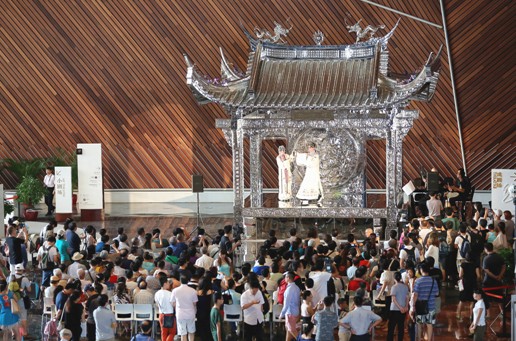 藝術裝置《古戲臺》高近8米,由雕塑家陳志光歷時一年完成,這也是首件國內當代藝術裝置作品展示在大劇院公共空間。戲臺以一座清代古戲臺為原形,采用不銹鋼材質鍛造,通體飾花紋,守舊之上為束蓮與金魚紋飾,屋檐四角高高翹起,有一種異樣的優(yōu)雅與莊重。《古戲臺》不僅引發(fā)人們獨特的視覺心理,同時承載演出的功能,昆曲、民樂四重奏、弦樂四重奏、京劇、鋼琴、漳州木偶戲等豐富多彩的演出將在《古戲臺》陸續(xù)上演。