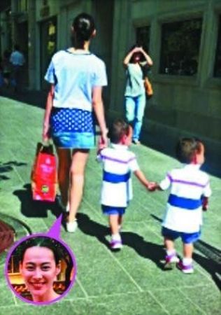 梁洛施近照,在多倫多帶一對雙胞胎兒子逛街。