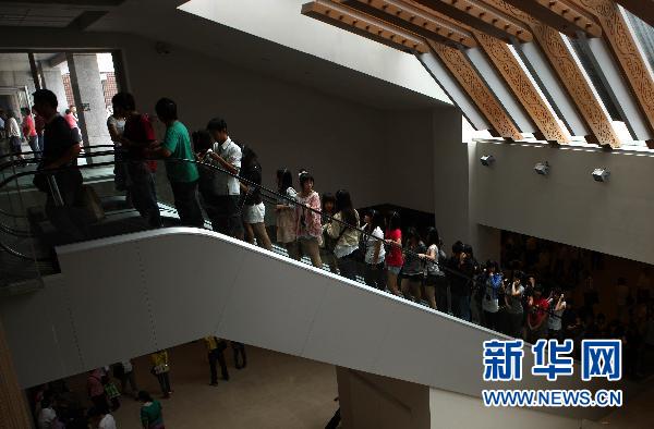 7月2日,游客乘坐電梯準(zhǔn)備開(kāi)始參觀。臺(tái)北故宮博物院藏品共約60萬(wàn)件,分為書(shū)法、古畫(huà)、碑帖、銅器、玉器、陶瓷、文房用具、雕漆、琺瑯器、雕刻、刺繡及緙絲、圖書(shū)、文獻(xiàn)等14類(lèi)。博物院經(jīng)常維持有5000件左右的書(shū)畫(huà)、文物展出,并定期或不定期舉辦各種特展,每天都吸引眾多參觀者。新華社記者 費(fèi)茂華 攝